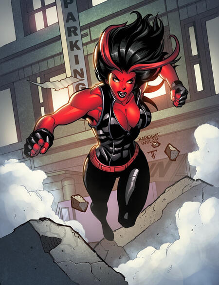 Superhuman Strength: Just like with the other members of the Hulk family, the Red She-Hulk has an exceptionally large physique and has been endowed with over-sized muscles. Although it has yet to be established just what her maximum strength is, she is visibly imbued with super strength, that rivals both She-Hulk and The Hulk himself, and can battle him toe to toe. She is strong enough to lift well over 100 Tons with zero effort.