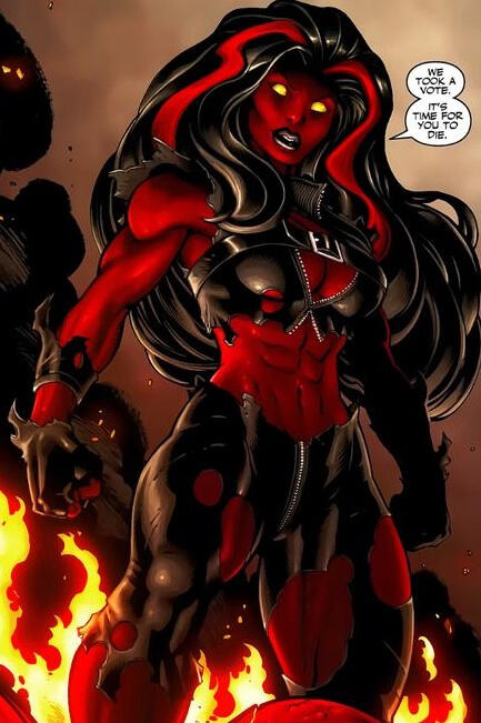 Superhuman Durability: Red She-Hulk's body is highly resistant to all forms of conventional injury. Her skin is capable of withstanding extreme pressures, temperatures, falls from great heights, field-artillery canon shells, and powerful energy blasts without sustaining any injury.